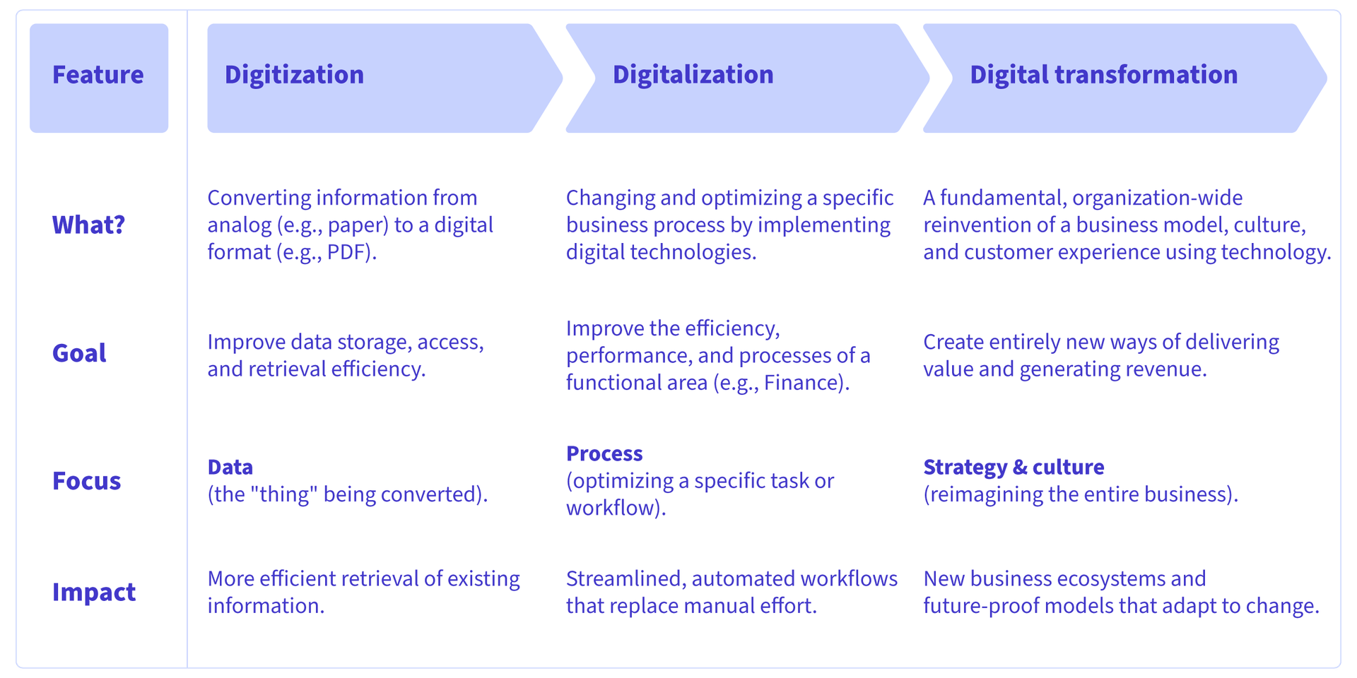 Digital transformation is the most expansive term, representing a strategic, organization-wide reinvention where digital technologies fundamentally reshape how businesses operate, deliver value, and engage customers. While, as we saw above, digitization converts paper/forms to digital files and digitalization automates individual processes (like e-invoicing), digital transformation asks: "How can technology enable entirely new ways of creating value?"